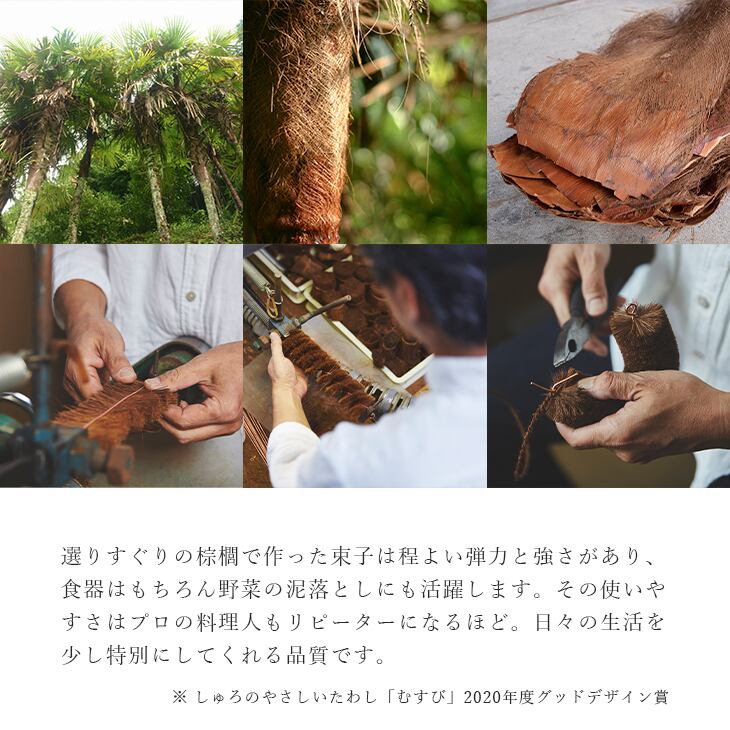 ■選りすぐりの棕櫚で作った束子は程よい弾力と強さがあり、食器はもちろん野菜の泥落としにも活躍します。その使いやすさはプロの料理人もリピーターになるほど。日々の生活を少し特別にしてくれる品質です。