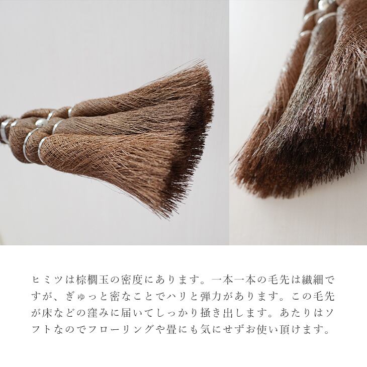 ■ヒミツは棕櫚玉の密度にあります。一本一本の毛先は繊細ですが、ぎゅっと密なことでハリと弾力があります。この毛先が床などの窪みに届いてしっかり掻き出します。あたりはソフトなのでフローリングや畳にも気にせずお使い頂けます。