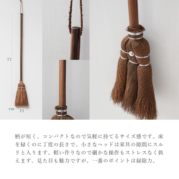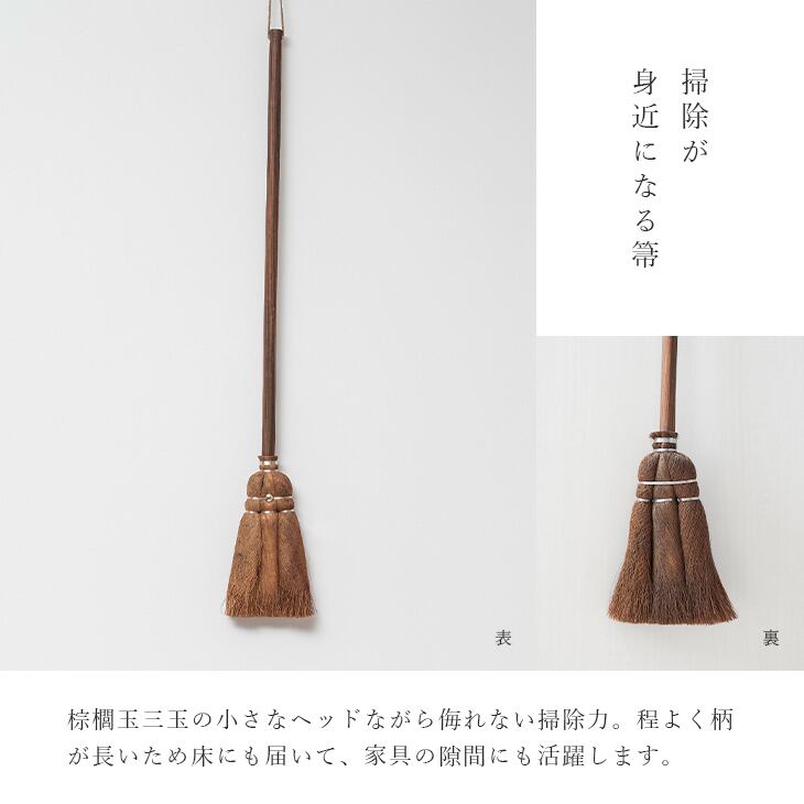 天然素材の棕櫚(しゅろ)で出来た日本製のほうき。毛先のあたりが優しいのでフローリングや畳にも最適です。棕櫚玉三玉の小さなヘッドながら侮れない掃除力。程よく柄が長いため床にも届いて、家具の隙間にも活躍します。