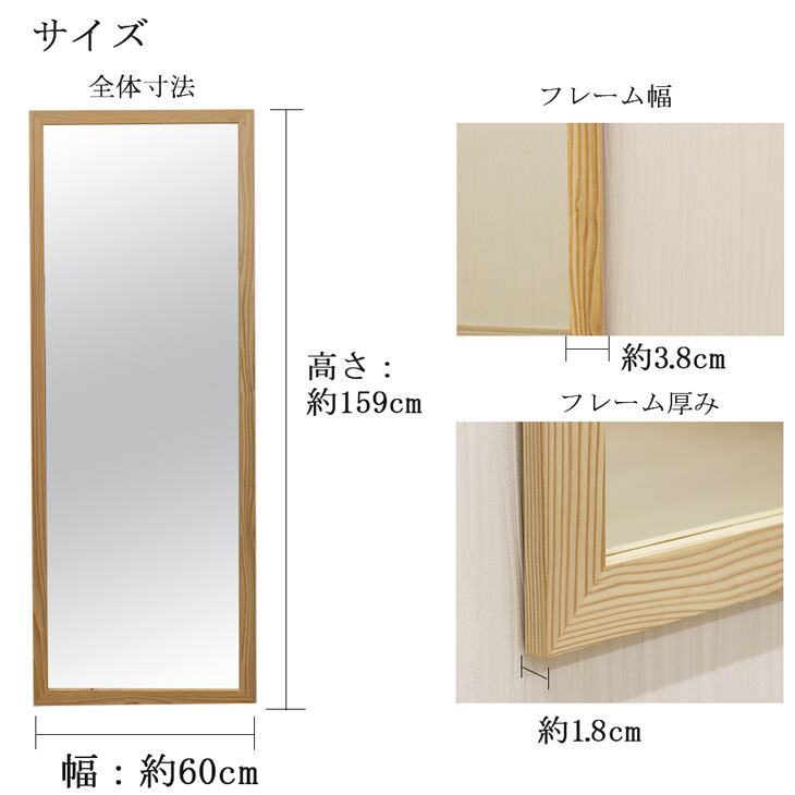 杉 ウォールミラー 幅60cm 高さ159cm 日本製 直送品 送料無料 インテリア鏡 姿見 生杉ミラー 壁掛けミラー 立て掛け 天然木ナチュラル 17311