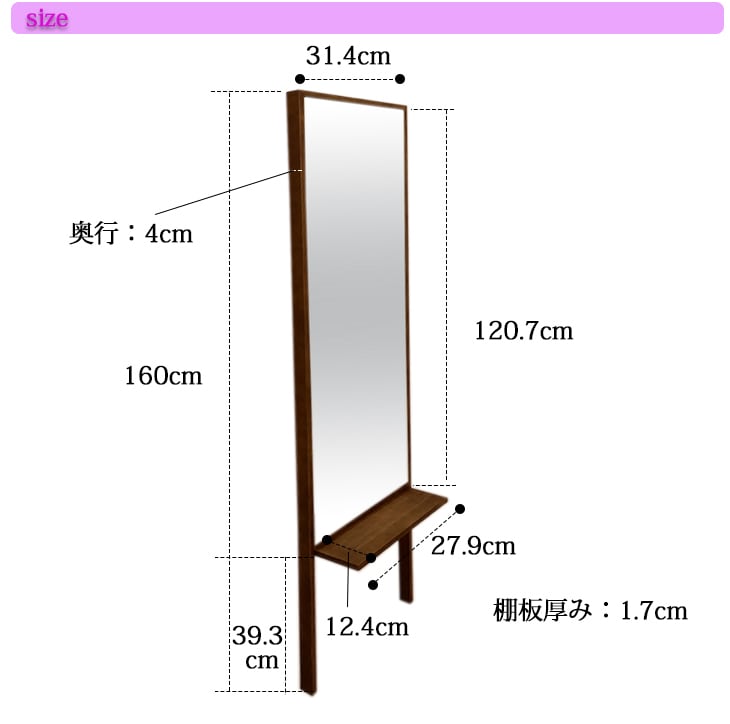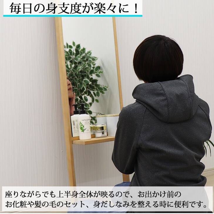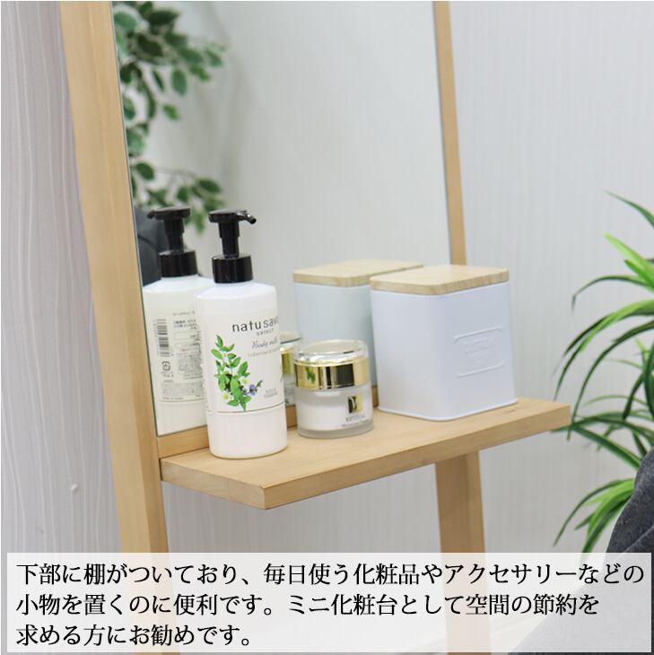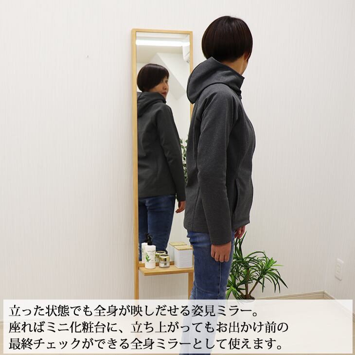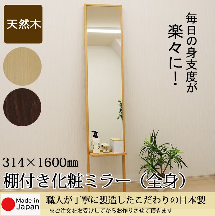 棚付き化粧ミラー 314×1600mm メイク 鏡 便利 化粧鏡 化粧ミラー 姿見 全身 身だしなみ おしゃれ 寝室 リビング シンプル 天然木 スペース 安心の国産メーカー直送品 転倒防止 日本製 33855 33856