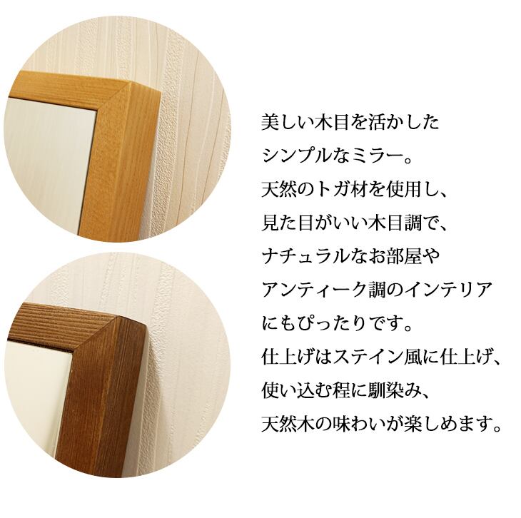 天然木トガ材、ミラー:3mm厚ガラス、ラッカー塗装(オイルステイン風仕上)